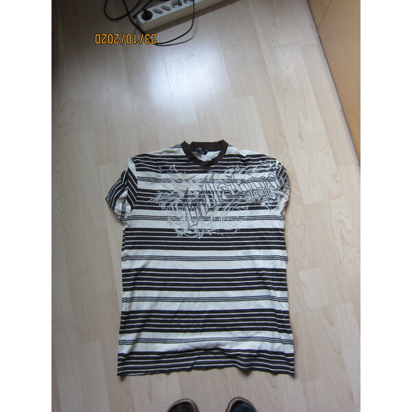 Es handelt sich um ein gestreiftes T-Shirt in den Farben braun und hellem beige. Auf der linken Seite ist ein großer Aufdruck Billabong und ein aufgesticktes Logo in weiß. Die einfache Brustweite ist 48 cm und die Gesamtlänge 64 cm.