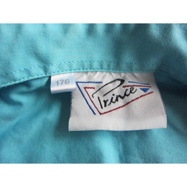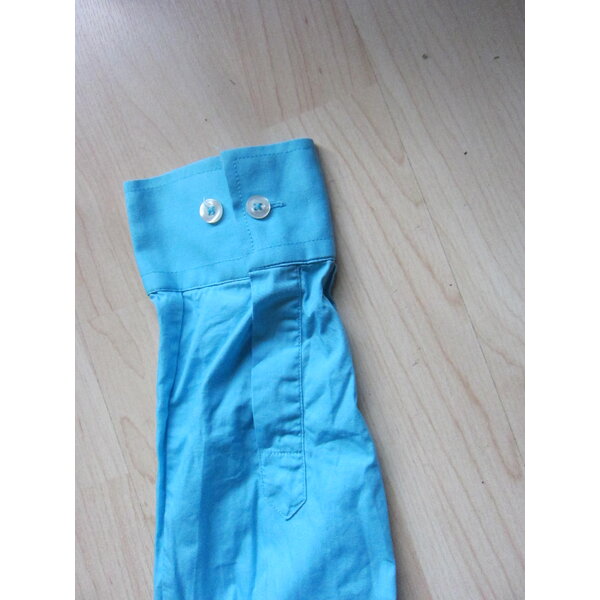 Ein tolles Hemd mit Kentkragen in einem tollen Blau. Angaben zum Material sind leider nicht mehr möglich, da das Etikett herausgetrennt wurde. Es hat eine Tasche auf der linken Brustseite. Die Ersatzknöpfe sind noch vorhanden. Die einfache Brustweite ist 44 cm und die Gesamtlänge 64 cm.