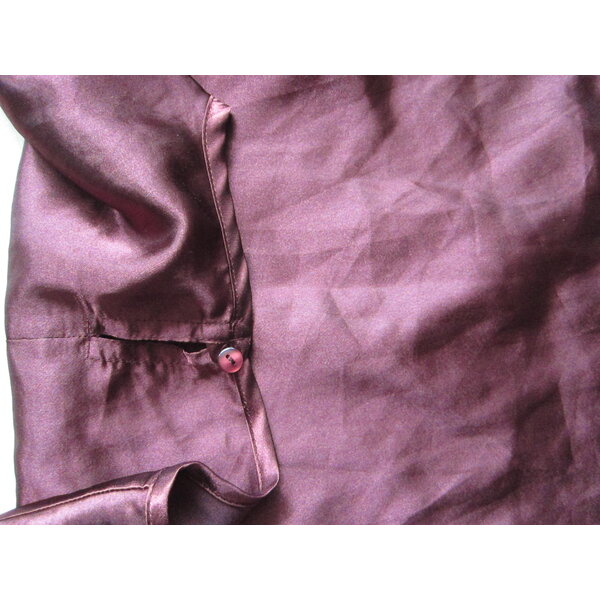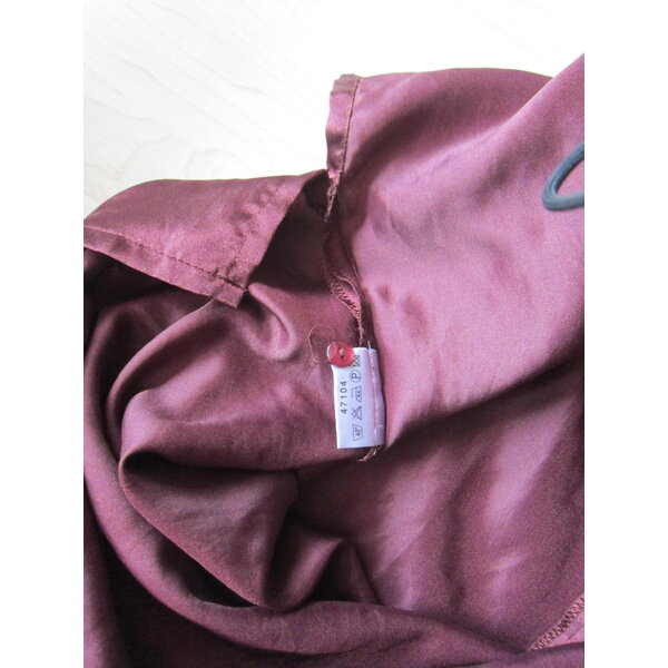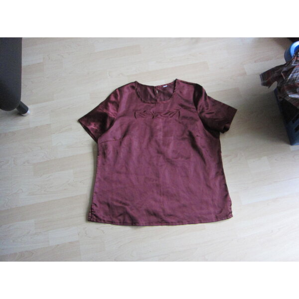 Das Shirt ist schimmernd bordeauxrot und hat kurze Ärmel. Aus 100 % Polyester. Die einfache Brustweite ist 55 cm und die Gesamtlänge 66 cm. Vorne ist unter dem Rundhalsausschnitt eine Stickerei in dem gleichen Farbton.