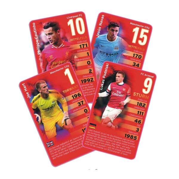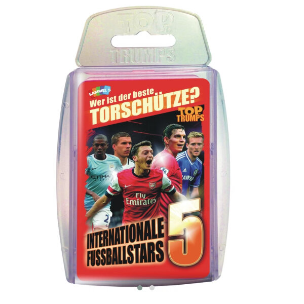 Mit den 30 Fußballstars kannst du groß auftrumpfen und mit deinem Fachwissen deine Freunde ins Abseits stellen. Gestochen wird um Größe, Geburtsjahr, Anzahl Länderspiele, Länderspieltore und Titel der Spieler. Dazu zeigt jede Karte ein actiongeladenes Spielerfoto, das Vereinsemblem, die Rückennummer und Spielposition und gibt wichtige Karriereinfos. Wie gut kennst du Messi, Özil oder Podolski? Wer gewann mehr Pokale? Finde es heraus – bei vielen Partien TOP TRUMPS Internationale Fußballstars 5 mit deinen Freunden. Denn nach dem Spiel ist vor dem Spiel!