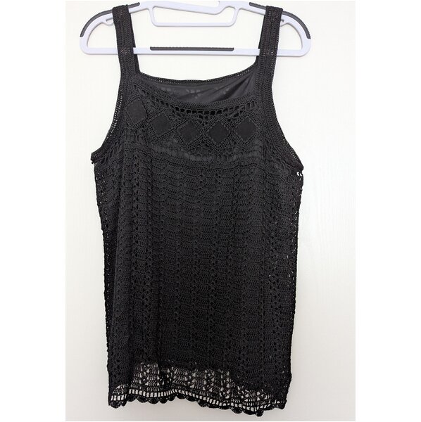 Außergewöhnliches Häkeltop aus Viskose, die für einen schweren, wertigen Fall bei seidiger Optik sorgt. Die Farbe ist Tiefschwarz. Es ist komplett gefüttert. Im Brustbereich sind kleine Einsätze aus Leder in das Häkelmuster eingearbeitet.