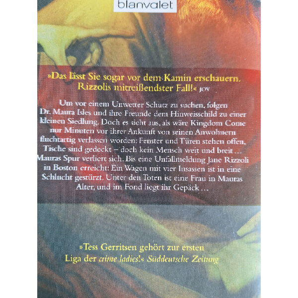 Dr. Maura Isles will in Kingdom Come Zuflucht vor dem Schneechaos finden. Doch es sieht aus, als hätten die Bewohner ihre Häuser nur Minuten vor ihrer Ankunft fluchtartig verlassen: Fenster und Türen stehen offen, Tische sind gedeckt – doch das Essen auf den Tellern ist festgefroren, kein Mensch weit und breit … Mauras Spur verliert sich. Bis eine Unfallmeldung Jane Rizzoli in Boston erreicht: Ein Wagen mit vier Insassen ist in eine Schlucht gestürzt. Unter den Toten ist eine Frau in Mauras Alter, und im Fond liegt ihr Gepäck …