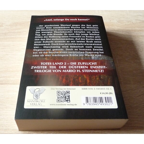 TOTES LAND 2 – DIE ZUFLUCHT ZWEITER TEIL DER DÜSTEREN ENDZEIT-TRILOGIE VON MARIO H. STEINMETZ! Der gnadenlose Wettlauf gegen die Zeit geht weiter! Eine unerklärbare Seuche hat Millionen von Menschen in blutrünstige Bestien verwandelt. Die wenigen Überlebenden kämpfen um jeden Tag, um jede Stunde. So auch der junge Markus. Allein die Hoffnung seine Freundin zu finden gibt ihm den Mut weiterzumachen. Auf der Suche nach einer Zuflucht erreicht er mit letzter Kraft seine Heimatstadt. Doch hier ist nichts mehr wie es einmal war. Gleichzeitig wird fieberhaft nach einem Gegenmittel gesucht. Doch es kommen Zweifel auf, ob die Seuche einen natürlichen Ursprung hat oder ob weit mächtigere Kräfte am Werke sind.