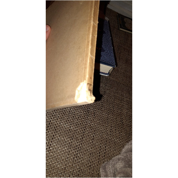 Deutliche Gebrauchsspuren. Papier nachgedunkelt. Kleines Loch am hinteren Einband. Ablösung am unteren Rücken. Siehe Bilder.