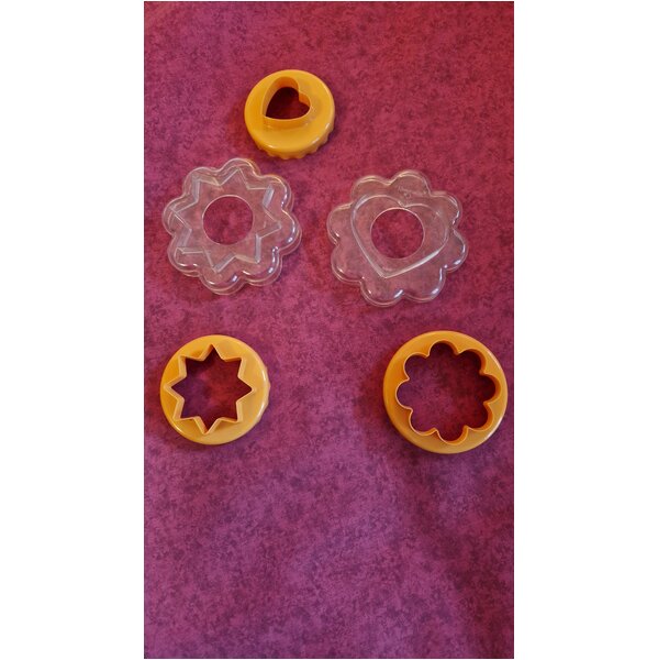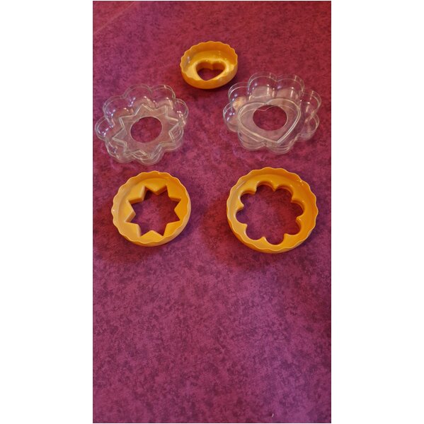 5 Ausstecher, je doppelseitig nutzbar. Kleines Herz, großes Herz, Stern, Blume. Können ineinandergestapelt gut verstaut werden.