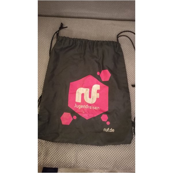 Praktischer dünner Rucksack mit Ruf Jugendreisen Aufdruck.