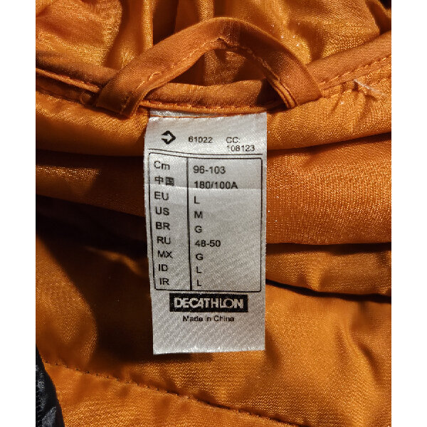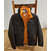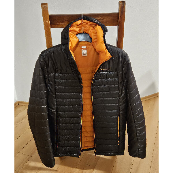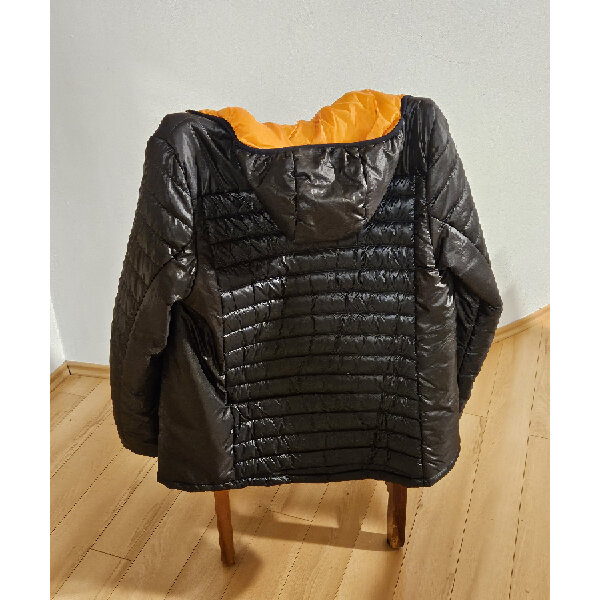 Leichte Steppjacke mit Kapuze und hochschließendem Reißverschluss. Außen schwarz, innen orange. Schmale Form.