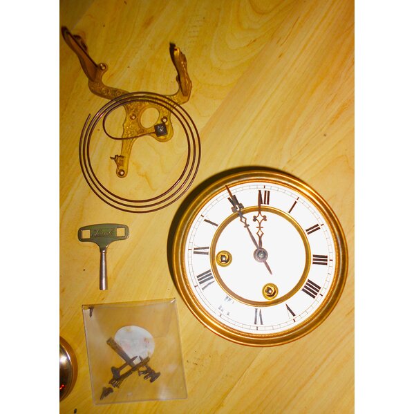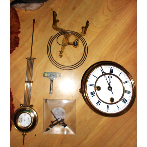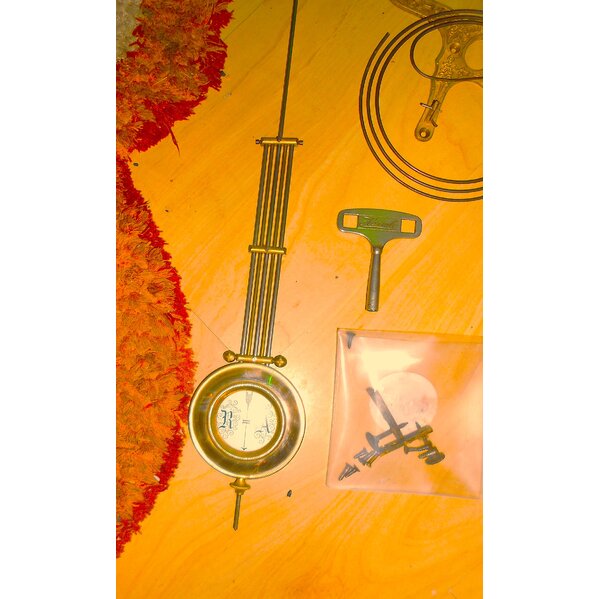 Aufziehschlüssel ist dabei - diverse alte Schrauben. Uhrwerk mit altertümlichem Ziffernblatt- Pendel mir Emailplatte und den Initialien der früheren Besitzer. Wahrscheinlich zu Zeiten von Wilhelm II. DasZiffernblatt ist circa 16 cm im Durchmesser. Der Pendel zum Einhängen cica 41 cm - Variabel dank Stellmutter.