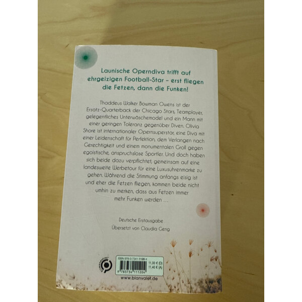 Thaddeus Walker Bowman Owens ist der Ersatz-Quarterback der Chicago Stars, Teamplayer, gelegentliches Unterwäschemodel und ein Mann mit einer geringen Toleranz gegenüber Diven. Olivia Shore ist internationaler Opernsuperstar, eine Diva mit einer Leidenschaft für Perfektion, dem Verlangen nach Gerechtigkeit und einem monumentalen Groll gegen egoistische, anspruchslose Sportler. Und doch haben sich beide dazu verpflichtet, gemeinsam auf eine landesweite Werbetour für eine Luxusuhrenmarke zu gehen. Während die Stimmung anfangs eisig ist und eher die Fetzen fliegen, kommen beide nicht umhin zu merken, dass aus Fetzen immer mehr Funken werden …
