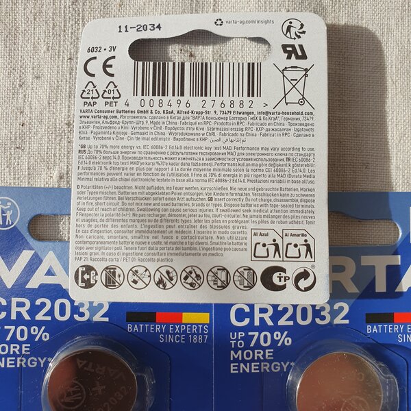 Hier gibt es 3 einzeln verpackte, nagelneue VARTA CR-2023 Litium Knopfzellen. Die Haltbarkeit ist mit 11-2034 angegeben.