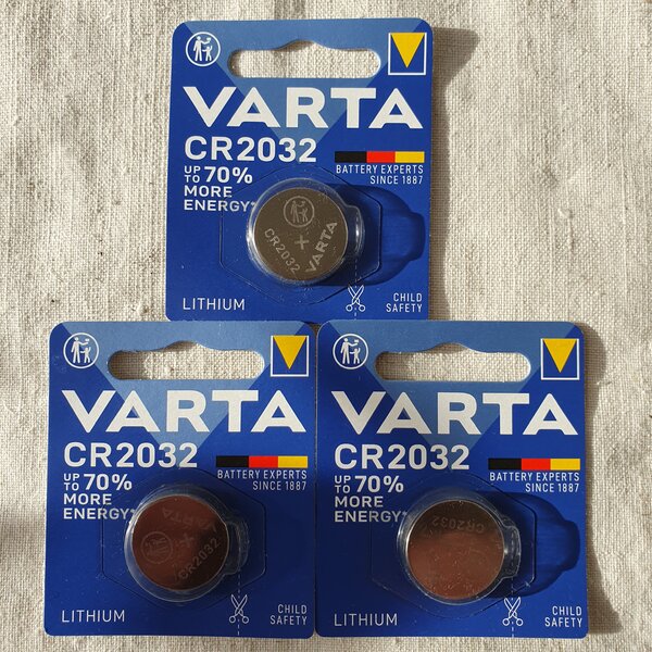 Hier gibt es 3 einzeln verpackte, nagelneue VARTA CR-2023 Litium Knopfzellen. Die Haltbarkeit ist mit 11-2034 angegeben.