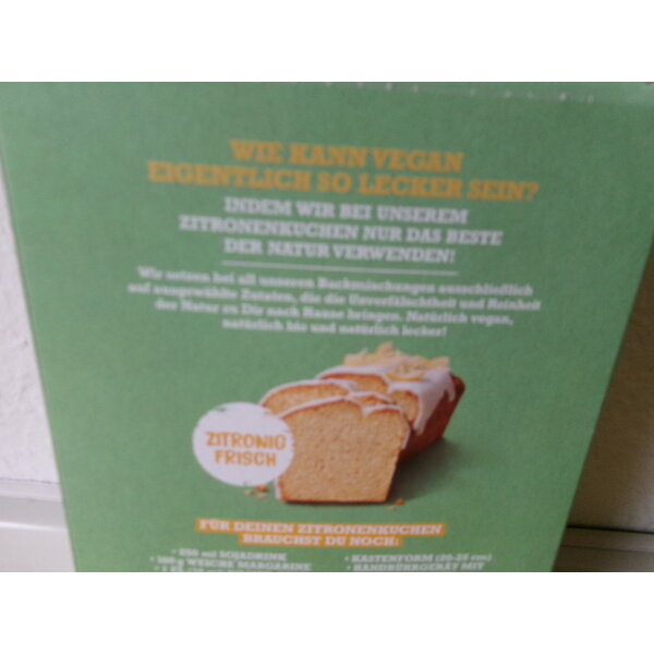 Diese Backmischung ist glutenfrei und vegan. Die Packung enthält: 400 g Backmischung und 50 g Zitronenmischung.