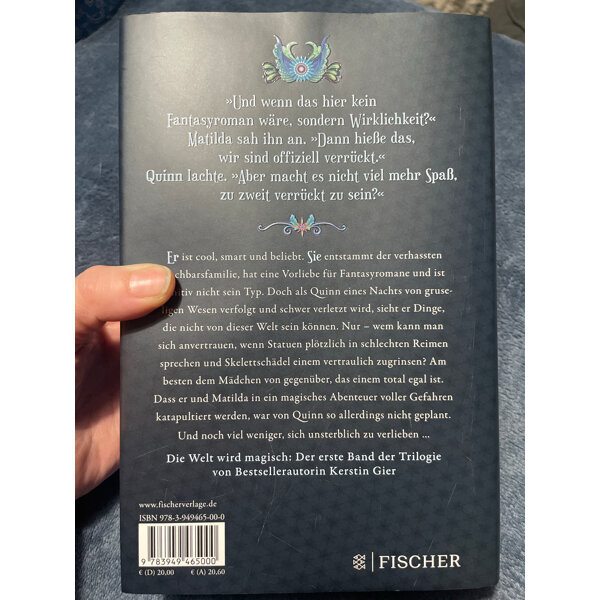 Quinn ist cool, smart und beliebt. Matilda entstammt der verhassten Nachbarsfamilie, hat eine Vorliebe für Fantasyromane und ist definitiv nicht sein Typ. Doch als Quinn eines Nachts von gruseligen Wesen verfolgt und schwer verletzt wird, sieht er Dinge, die nicht von dieser Welt sein können. Nur – wem kann man sich anvertrauen, wenn Statuen plötzlich in schlechten Reimen sprechen und Skelettschädel einem vertraulich zugrinsen? Am besten dem Mädchen von gegenüber, das einem total egal ist. Dass er und Matilda in ein magisches Abenteuer voller Gefahren katapultiert werden, war von Quinn so allerdings nicht geplant...