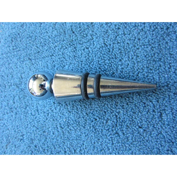ES handelt sich um einen schweren einzelnen Verschluss für Weinflaschen in silber 9 cm lang und mit zwei schwarzen Gummiringen für das Abdichten der Flasche. Obendrauf ist eine Kugel. Der Verschluss ist ca. 100 g schwer.