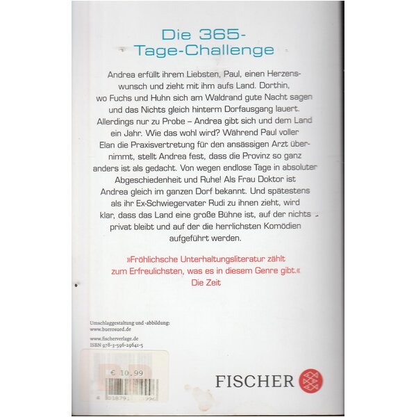 Andrea erfüllt ihrem Liebsten, Paul, einen Herzenswunsch und zieht mit ihm aufs Land. Dorthin, wo Fuchs und Huhn sich am Waldrand gute Nacht sagen und das Nichts gleich hinterm Dorfausgang lauert. Allerdings nur zu Probe – Andrea gibt sich und dem Land ein Jahr. Wie das wohl wird? Während Paul voller Elan die Praxisvertretung für den ansässigen Arzt übernimmt, stellt Andrea fest, dass die Provinz so ganz anders ist als gedacht. Von wegen endlose Tage in absoluter Abgeschiedenheit und Ruhe! Als Frau Doktor ist Andrea gleich im ganzen Dorf bekannt. Und spätestens als ihr Ex-Schwiegervater Rudi zu ihnen zieht, wird klar, dass das Land eine große Bühne ist, auf der nichts privat bleibt und auf der die herrlichsten Komödien aufgeführt werden.