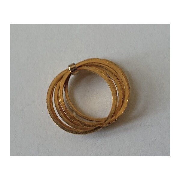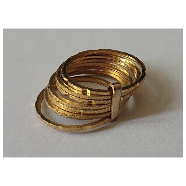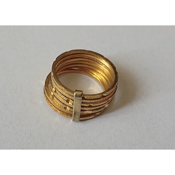 Feiner goldfarbener Ring, der aus sieben schmalen, einzelnen Ringen besteht, und durch einen Steg (beweglich) zusammengehalten wird