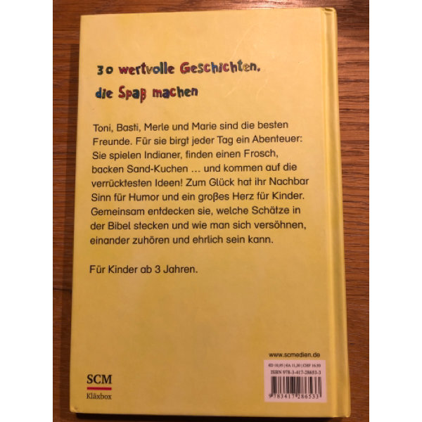 30 kleine Abenteuergeschichten für Kinder ab 3 Jahren. Toni, Basti, Merle und Marie sind die besten Freunde. Gemeinsam bestreiten sie Abenteuer des Alltags, die jedes Kindergartenkind kennt: Sie spielen Indianer, finden einen Frosch, backen Sand-Kuchen … Dabei begegnen sie immer wieder biblischen Aussagen und erleben eine Menge Überraschungen. Geschickt zeigt die Autorin Irina Kostic ("Sieben Jahre ohne Pommes"), wie schon die Kleinen biblische Werte im Alltag umsetzen können: z. B. sich versöhnen, einander zuhören und ehrlich sein.