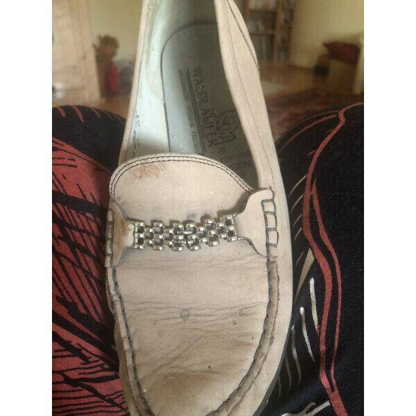 Der linke Schuh hat 2 Flecken, die wahrscheinlich mit einem Mikrofaser Tuch wieder rausgehen.