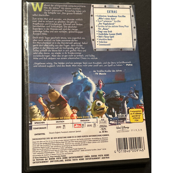 Zum ersten Mal wird verraten, wie Monster wirklich sind. Und es ist kaum zu glauben: Da gibt es Angsthasen und Draufgänger, Schussel und Streber, Sensibelchen und Schlauköpfe. Die absoluten Superstars in der Monsterwelt sind der riesige, gutmütige Sulley und sein vorlauter, glubschäugiger Assistent Mike. Doch eines Tages ist etwas geschehen, was eigentlich nie, aber auch wirklich nie hätte passieren dürfen: Ein Menschenkind ist in die Monsterwelt gelangt. Sofort gerät dort alles völlig aus den Fugen, denn Kinder gelten in der Monsterwelt als hochgradig giftig! Nur Sulley schließt die kleine Buh in sein großes Herz und setzt alles daran sie wieder in ihr Kinderzimmer zurückzubringen. Aber das ist gar nicht so einfach, und Sulley, Mike und Buh stolpern von einem urkomischen Chaos ins nächste...