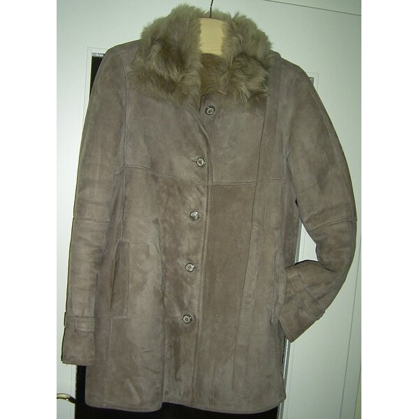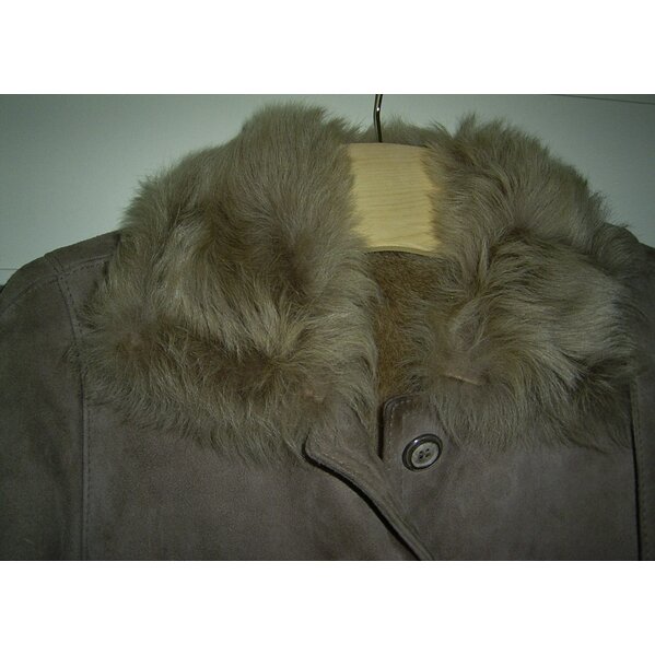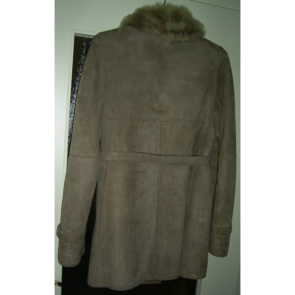 Echte Wildleder-Jacke für Damen, komplett mit Fell gefüttert und mit Fellkragen in Hellbraun.