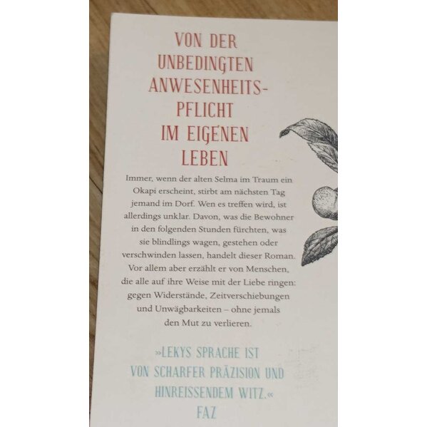 Selma, eine alte Westerwälderin, kann den Tod voraussehen. Immer, wenn ihr im Traum ein Okapi erscheint, stirbt am nächsten Tag jemand im Dorf. Unklar ist allerdings, wen es treffen wird. Davon, was die Bewohner in den folgenden Stunden fürchten, was sie blindlings wagen, gestehen oder verschwinden lassen, erzählt Mariana Leky in ihrem Roman.