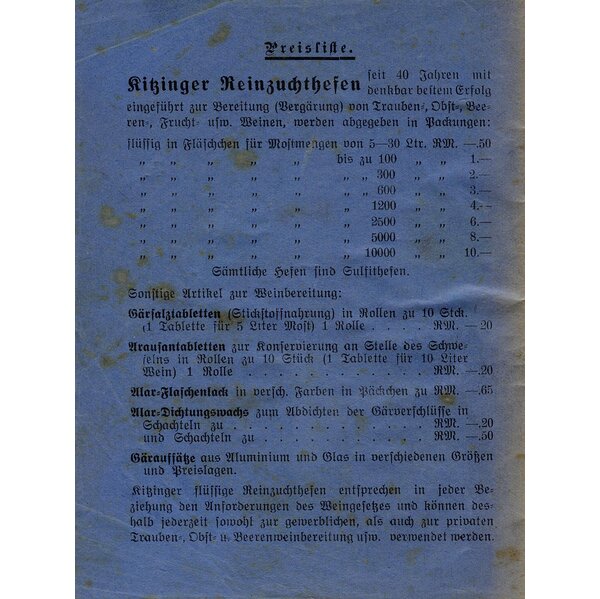 Alte Anleitung zur Weinherstellung mit besonderem Verweis auf die Marke Kitzinger Reinzuchthefen.