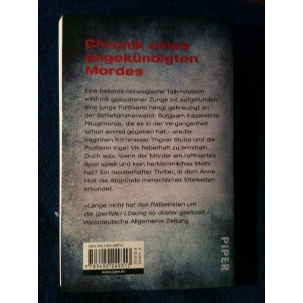 Eine beliebte Talkmasterin wird mit gespaltener Zunge tot aufgefunden, eine junge Politikerin hängt gekreuzigt an der Schlafzimmerwand: Sorgsam inszenierte Ritualmorde, die es in der Vergangenheit schon einmal gegeben hat, wieder beginnen Kommissar Yngvar Stubø und die Profilerin Inger Vik fieberhaft zu ermitteln. Doch was, wenn der Mörder ein raffiniertes Spiel spielt und kein herkömmliches Motiv vorhanden ist? Ein meisterhafter Thriller, in dem Anne Holt die Abgründe menschlicher Eitelkeiten erkundet