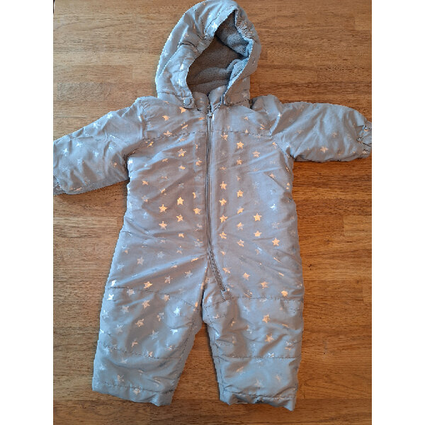 Wattierter Schnee-Overall in Größe 62/68cm (2-6 Monate) mit abnehmbarer Kapuze. Die Ärmel und Beine sind im einem inneren Gummiabschluss verstärkt. An den Beinen sind zusätzliche Gummibänder zur Fixierung am Schuh. Der Overall ist grau mit aufgedruckten Sternen.