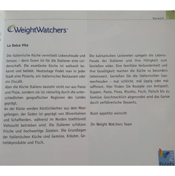 Tauchen Sie ein in die kulinarische Welt der Weight Watchers mit dem Kochbuch "Weight Watchers Italien – Points Plus". Die dritte Auflage dieses Taschenbuchs aus dem Jahr 2003 führt Sie auf 80 Seiten durch die vielseitigen und gesunden Genüsse der italienischen Küche. Mit seiner klaren Struktur und reichlichen Rezepten, die speziell für das Points-System konzipiert wurden, ist es der ideale Begleiter für Liebhaber der mediterranen Aromen und diejenigen, die auf eine ausgewogene Ernährung achten möchten.