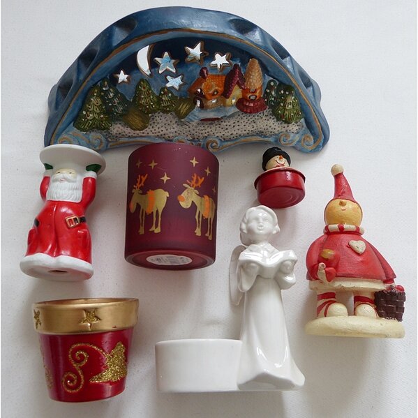 Konvolut an Kerzen- bzw. Teelichthalter bzw. zwei Kerzen dabei, mit weihnachtlichen Motiven.