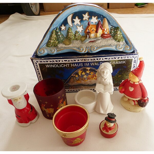 Das Windlicht, der Engel und der Weihnachtsmann sind aus Porzellan oder Keramik, so etwas in der Art.