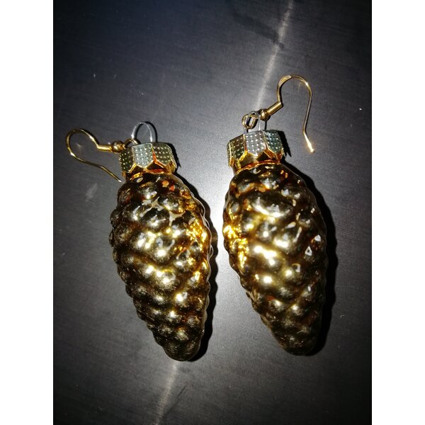 Ein Paar Weihnachts-Ohrringe mit Tannenzapfen, goldfarben glänzend, Länge 4 cm, von mir frisch zusammengebastelt. Ohrhaken sind Edelstahl.