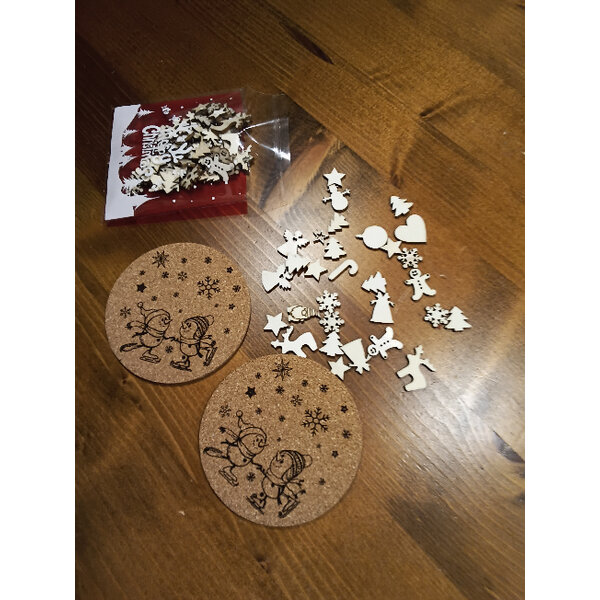 hübsche Streudeko aus Holz mit Weihnachtsmotiven, zwei Untersetzer aus Kork, handgemacht