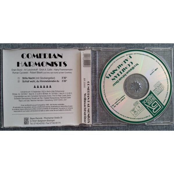 "CD-Single" (Normalformat, problemlos in jedem Laufwerk) mit zwei Weihnachtsliedern, gesungen von den Comedian Harmonists, aufg. 1932, digitale Überspielung von 1998.
