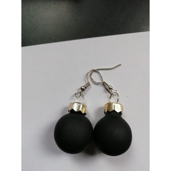 Ein Paar Ohrringe mit Weihnachtskugeln, schwarz matt, Durchmesser 2 cm, von mir frisch zusammengebastelt. Ohrhaken sind Edelstahl.