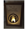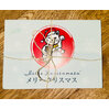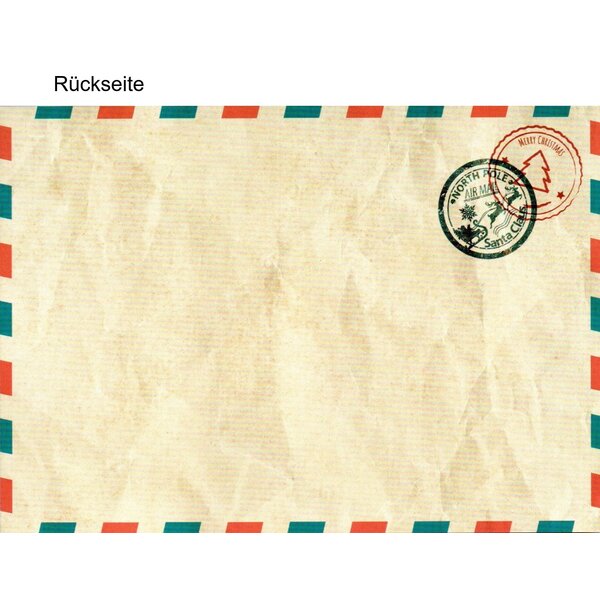 Weihnachtsmann mit Schlitten und Rentieren, Briefmarke und Poststempel, Luftpost-Umrandung, Schriftzug "Merry Christmas".