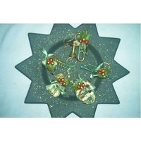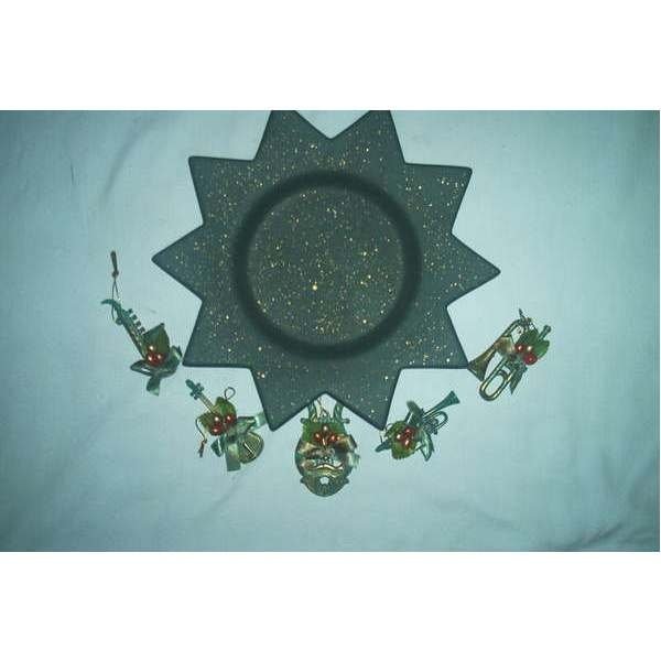 massiver, schwerer dunkelgrüner Weihnachtsteller in Sternform und mit Goldstaub in der Glasur - und dazupassend 5 Stück Baumbehang in grün- gold - der Baumbehang sind alles Musikinstrumente - siehe Fotos
