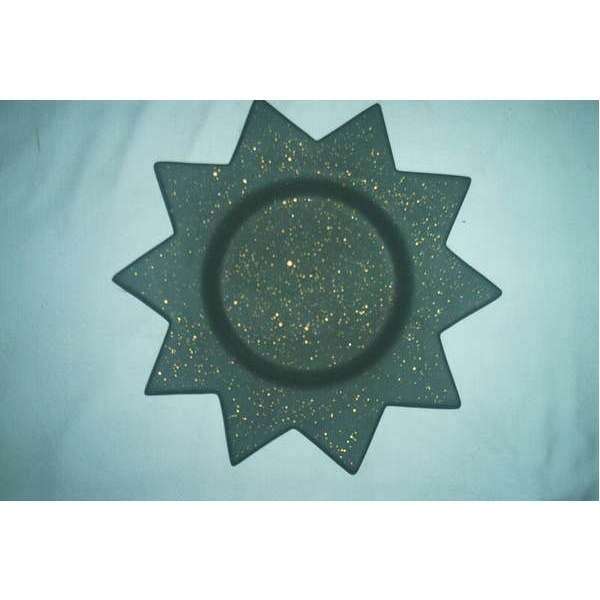 massiver, schwerer dunkelgrüner Weihnachtsteller in Sternform und mit Goldstaub in der Glasur - und als Zugabe 5 Stück Baumbehang in grün- gold - der Baumbehang sind alles Musikinstrumente - siehe Fotos