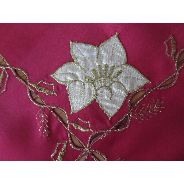 Farbe: bordeauxrot mit cremefarbener Blume und goldfarbener Stickerei