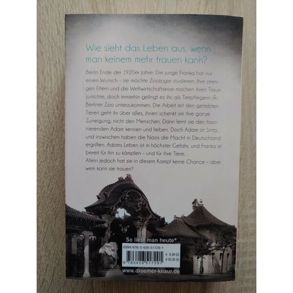 Dann lernt sie den faszinierenden Adam kennen und lieben. Doch Adam ist Sinti, und inzwischen haben die Nazis die Macht in Deutschland ergriffen. Adams Leben ist in höchster Gefahr, und Franka ist bereit, für ihn zu kämpfen – und für ihre Tiere. Fortan weiß sie nicht mehr, wem sie trauen kann.
