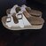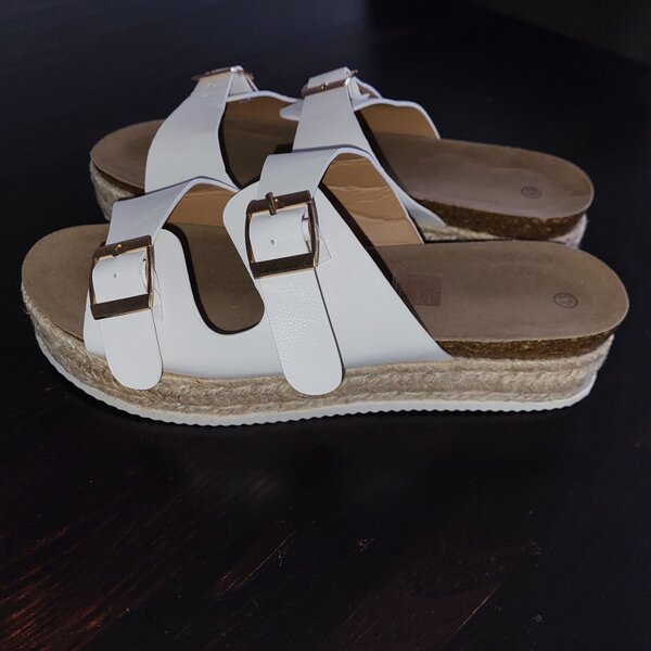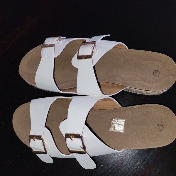 Hier gebe ich ein paar neue, weiße Pantoletten mit goldenen Verschlüssen ab. Sie sind als 43 ausgeschrieben, aber das kommt nicht hin. Ich habe einen sehr breiten und dicken Fuß und trage eigentlich 42. Mir sind sie etwas spack. Eine normale 42 oder eine kräfige 41 passt sicher gut rein. Ich hab die Sohlenlänge mal gemessen und es sind 27 cm. Sie haben eine Plateausohle 3 cm hoch, die geflochten gestaltet ist ( wie bei Espadrilles) Die Einlegesohlen kann man rausnehmen, also auch eigene Sohlen einlegen.