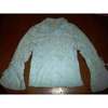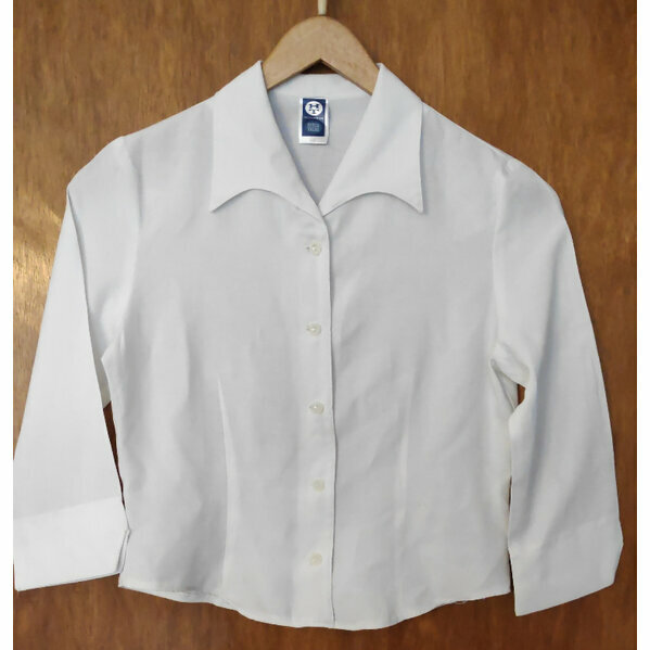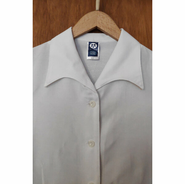 Hübsche weiße Bluse in Taillenlänge, 3/4-Ärmel mit kleinem Ausschnitt am Bündchen, besondere Kragenform, 5 Knöpfe in Blumenform, waschbar bei 40 °C.