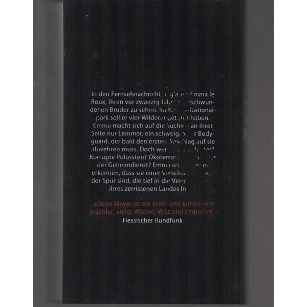 Er nennt sich Lemmer, er ist weiß, und sein Job ist es, unsichtbar zu sein, der Bodyguard im Schatten. Als Emma le Roux, eine weiße Südafrikanerin, ihn anheuert, hofft Lemmer auf einen schnellen, harmlosen Job. Er soll Emma zum Krüger Nationalpark begleiten. Sie meint, ihren vor zwanzig Jahre verschwundenen Bruder in den Fernsehnachrichten gesehen zu haben. Angeblich hat er skrupellos vier Wilderer getötet, die ein Reservat überfielen. Kaum sind sie im Krüger-Park angekommen, muss Lemmer eine giftige Schlange töten, die jemand in Emmas Apartment geschmuggelt hat. Er beginnt zu begreifen, dass er einer Sache auf der Spur ist, die etliche Nummern zu groß und zu gefährlich für ihn ist. Dann, nach ihrer ersten Liebesnacht wird Emma schwer verletzt. Allein versucht Lemmer ihren Angreifer zu finden.
