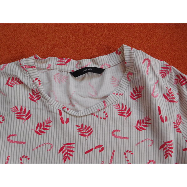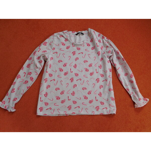 Ärmel sind hübsch gerüscht abgesteppt. 95 % Cotton, 5 % Elasthan für bessern Sitz und so weitet es sich nicht