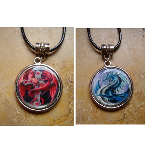 Der Anhänger ist aus Tibetsilber, auf einer Seite ist ein roter Drache abgebildet, auf der Rückseite ein blauer Drache. Der Durchmesser beträgt ca. 3 cm.