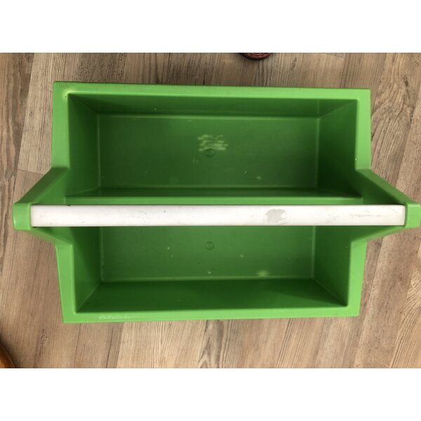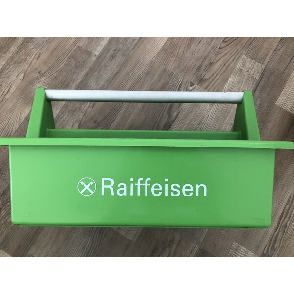 Der Kasten trägt beidseitig den Werbeaufdruck Raiffeisen. Er wurde bei uns für Gartenwerkzeug genutzt.