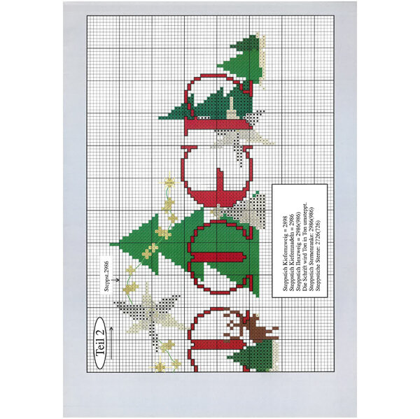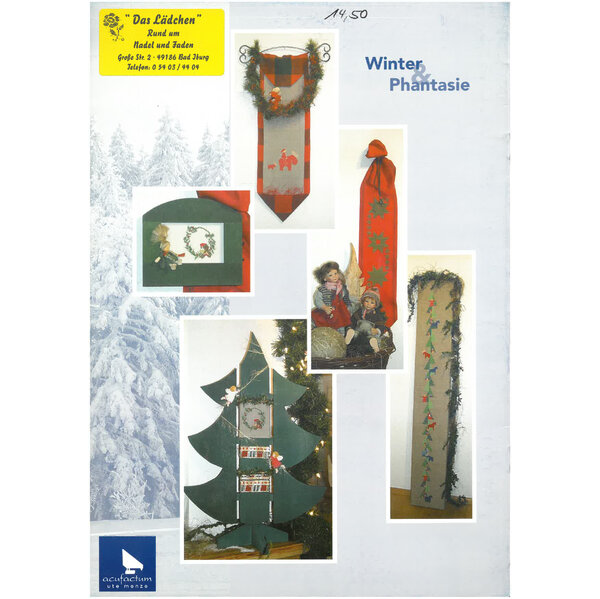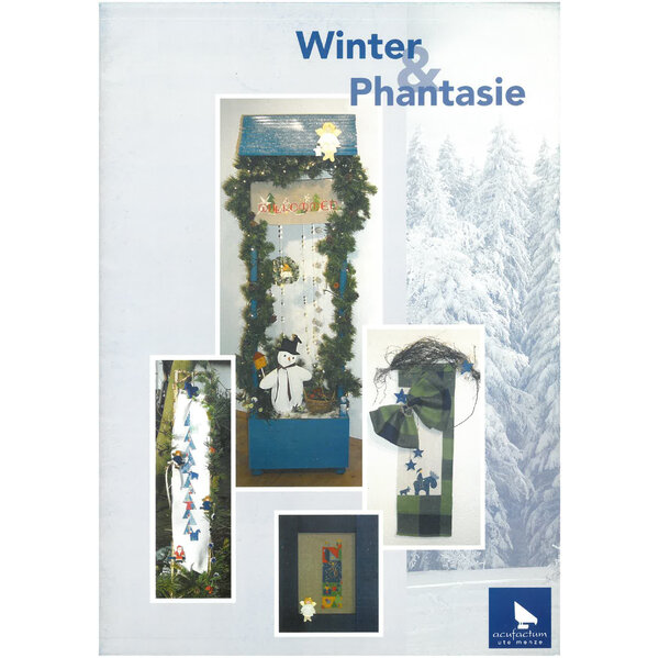 Hier sind etliche Kreuzstich-Arbeiten zu winterlichen Motiven farbig abgebildet. Die Farbcodes und Stickmuster sind ebenfalls in Farbe zu sehen.