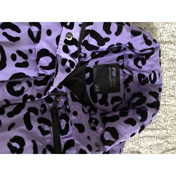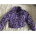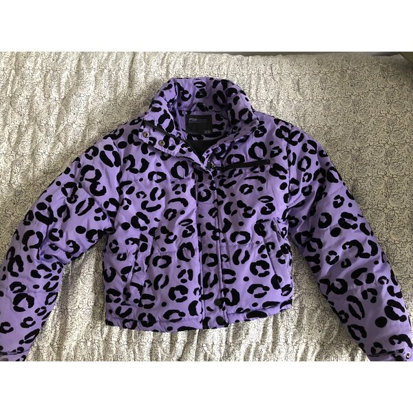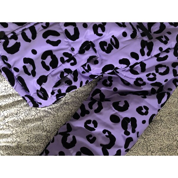 Kurze warme Jacke aus glatten Lila Stoff mit schwarzem Leo-Muster aus Samt. Sehr gemütliche Jacke und sie hält sehr warm. Taschen an der Seite und eine an der Brust. Zu schließen mit Reißverschluss und Druckknopf.