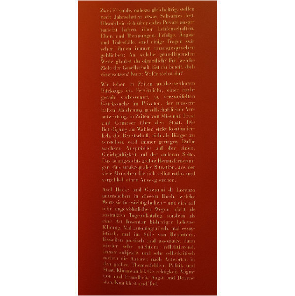 Zwei Freunde, nahezu gleichaltrig, stellen fest, dass sie sich in Jahrzehnten über vieles Private ausgetauscht haben, Leidenschaften, Ehen und Trennungen, Erfolge, Ängste und Todesfälle, dass aber eines zwischen ihnen seltsam unbesprochen blieb: An welche grundlegenden Werte glaubst du eigentlich, wenn es nicht um dich, sondern um uns alle geht? Was ist wirklich wichtig in diesem Land? Für welche Ziele der Gemeinschaft bist du bereit, dich einzusetzen? Kurz: Wofür stehst du? Wir leben in Zeiten unübersehbaren Rückzugs ins Persönliche, einer nachgerade verbissenen, ja, verzweifelten Glückssuche im Privaten, der massenhaften Ablehnung gesellschaftlicher Verantwortung, in Zeiten von Missmut, Frust und Gemoser über den Staat. Die Beteiligung an Wahlen sinkt kontinuierlich, die Bereitschaft, sich als Bürger zu verstehen, wird immer geringer. Dafür wachsen Ansprüche auf der einen, Gleichgültigkeit auf der anderen Seite...