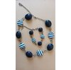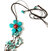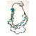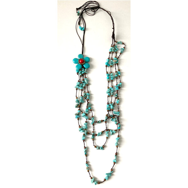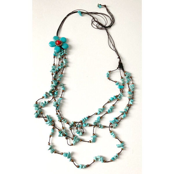 Tolle Halskette mit türkisen Steinchen an mehrreihigem dünnen dunkelbraunen Band (Kunstleder?) mit größerer türkiser Blume auf einer Seite.